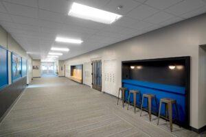 The corridors were redesigned to provide vibrant study spots and break-out spaces for students while promoting the FTC brand and school pride. FTC staff offices and a welcoming and secure entrance for students and visitors is located on Wall Ave.