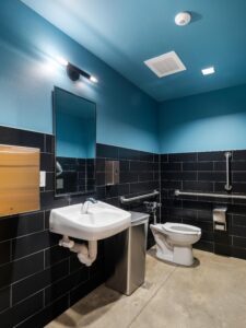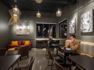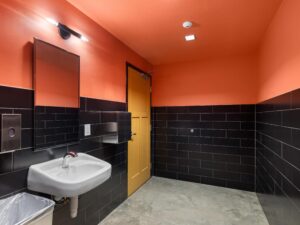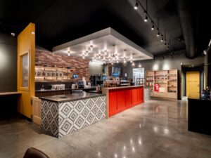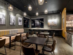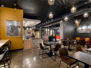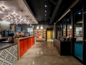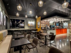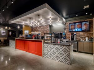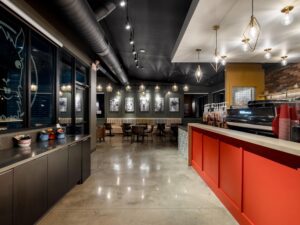 With a larger café space, the owners wanted a “same, but different” approach to the design, so several features are repeated while some colors and textures in the lighting and finish palette are new.